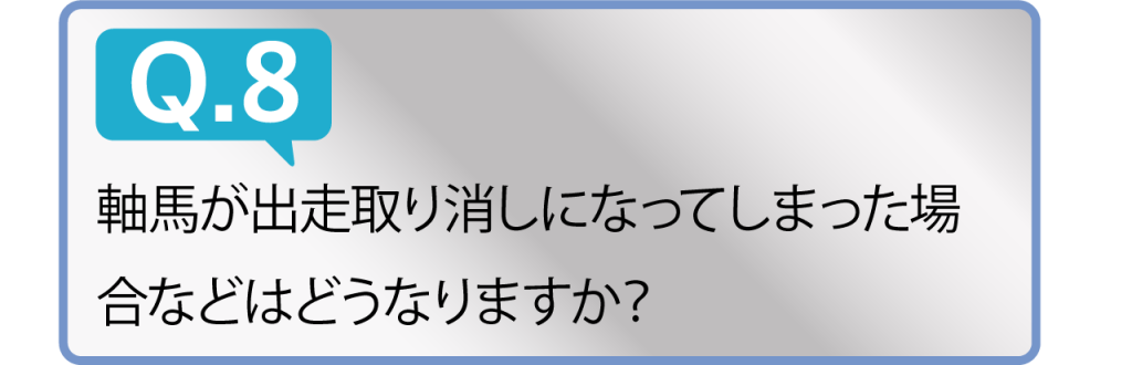 情報提供後、何らかのアクシデントで「軸馬」及び「買い目指定対象馬」が出走取り消しになった場合は、結果的にその買い目が的中となった場合でも、その情報にご参加いただいた料金相当分を「機構POINT」として返還致します。尚、その様なケースが発生する場合も往々にしてございますので、「買い目の購入は出来る限り締め切り時刻に近い時間」に行っていただきますようお願いをしております。
